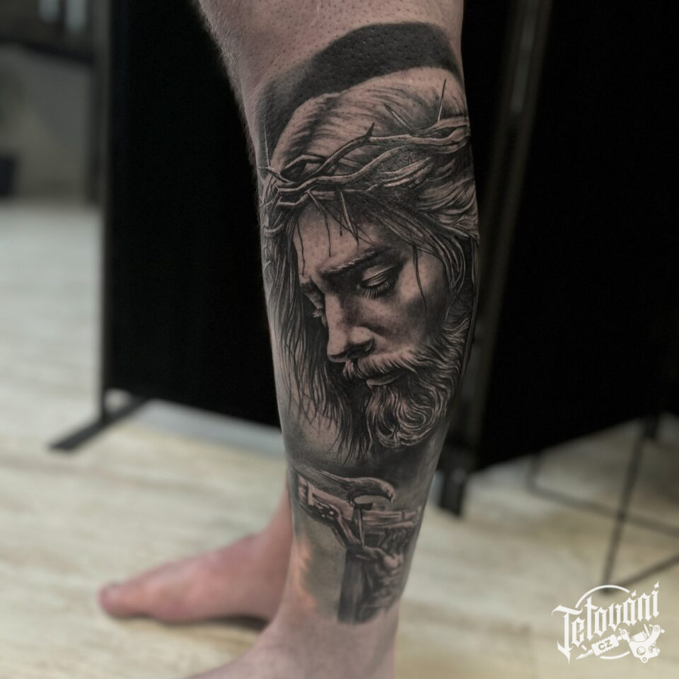 Tetování náboženství, portrét Ježíše Krista na lýtku