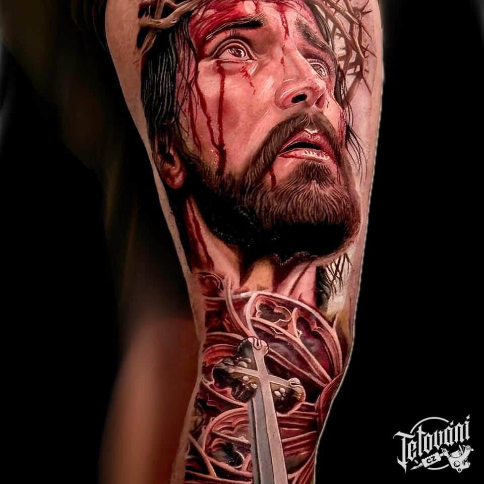Tetování náboženství, portrét Ježíše Krista na noze