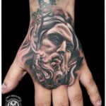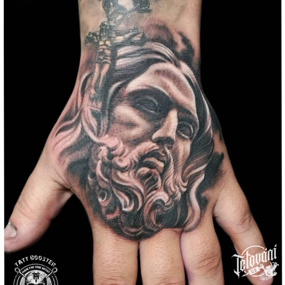 Tetování náboženství, portrét Ježíše Krista s růžencem na hřbetu ruky