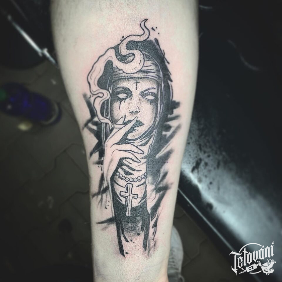 Tetování náboženství, portrét na lýtku