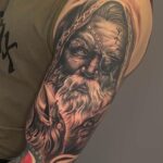 Tetování náboženství, portrét Odina a ptáci havrani na rameni
