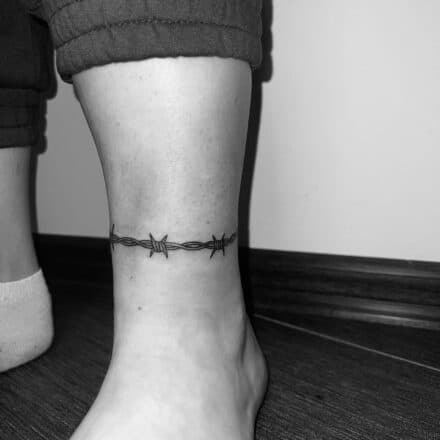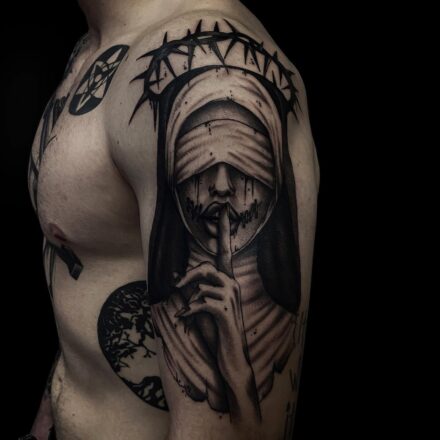 Tetování náboženství, portrét Panny Marie a Ježíše, hodiny, nápisy, ostnatý drát, rukáv