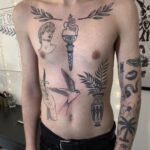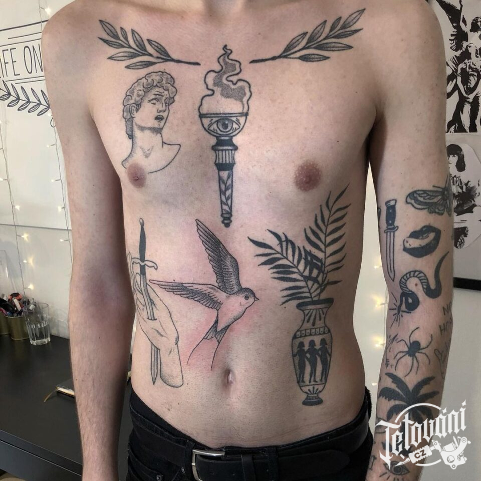 Tetování náboženství, pták, meč, oko na břichu