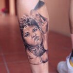 Tetování náboženství, symbol lásky Amor, portrét na lýtko