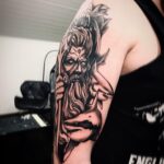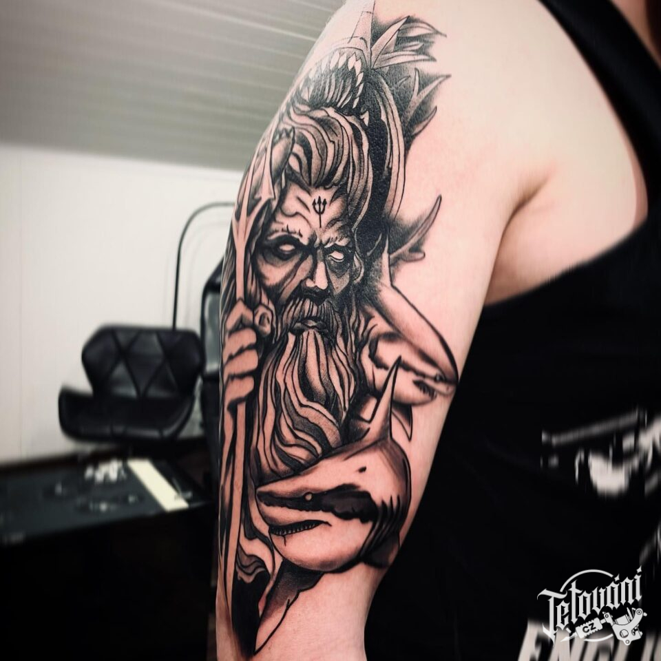Tetování náboženství, zvíře, žralok a portrét Poseidona na rameni