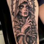 Tetování nadpřirozená bytost, čarodějnice, smrt, had, ostnatý drát, symboly na stehno