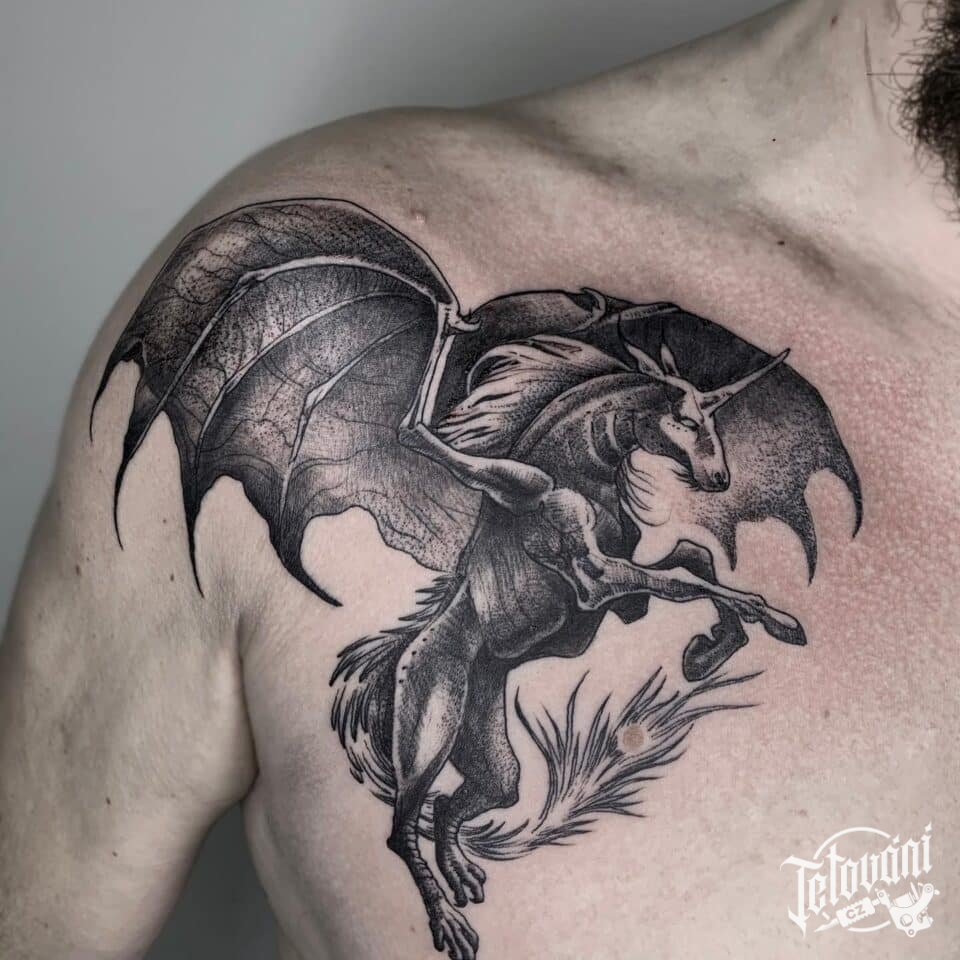 Tetování nadpřirozená bytost, jednorožec na hrudi