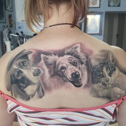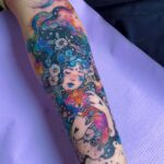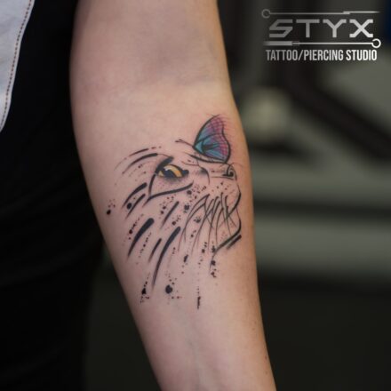 Tetování nadpřirozená bytost, květiny, kočka na předloktí