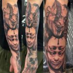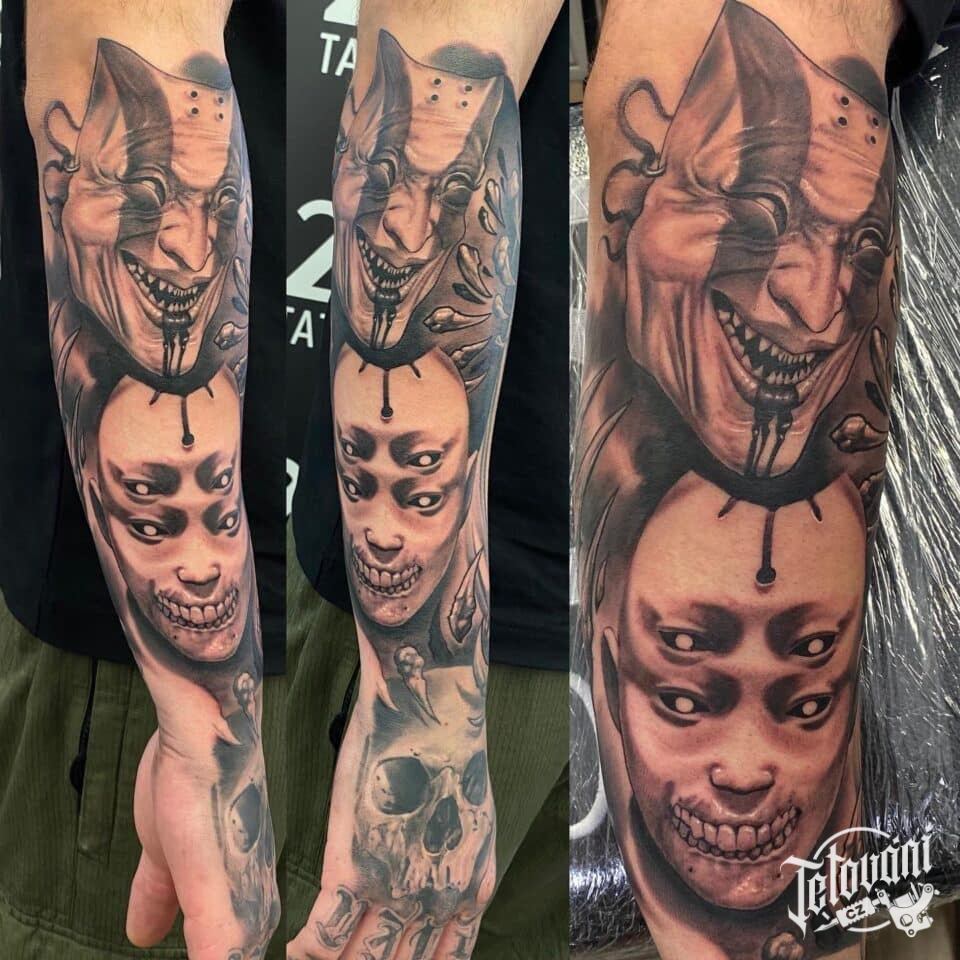 Tetování nadpřirozená bytost, maska, lebka na předloktí