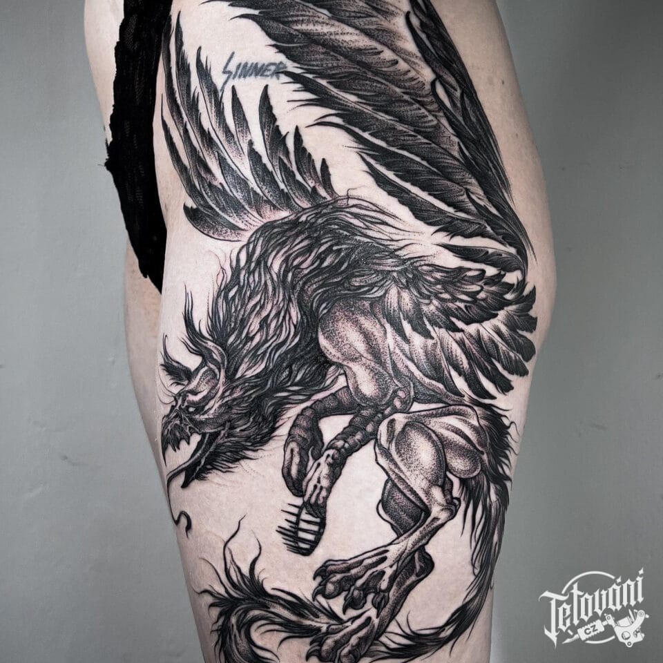 Tetování nadpřirozená bytost na boku stehna