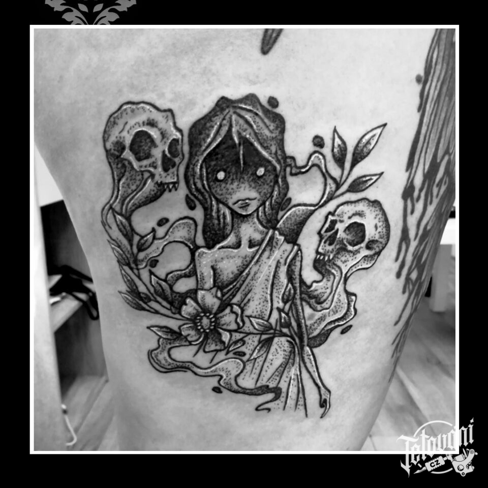 Tetování nadpřirozená bytost na boku stehna