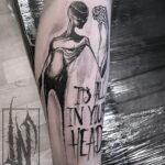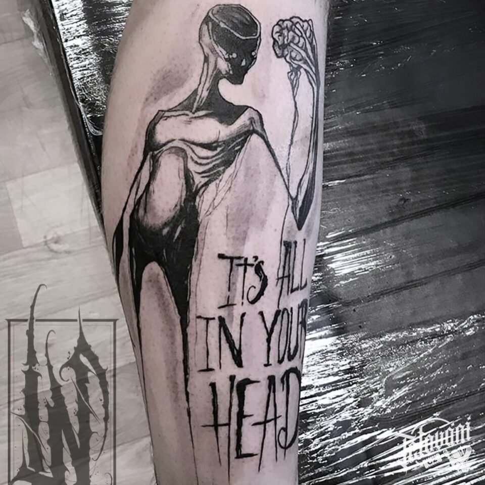 Tetování nadpřirozená bytost, nápisy na lýtku