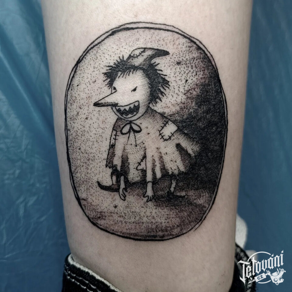 Tetování nadpřirozená bytost, postavička čarodějnice na lýtku