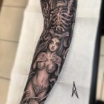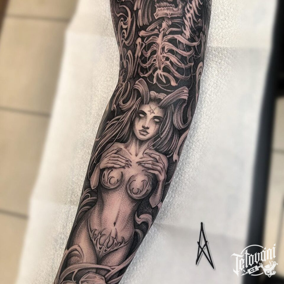 Tetování nadpřirozené bytosti, čarodějnice a kostlivec, rukáv