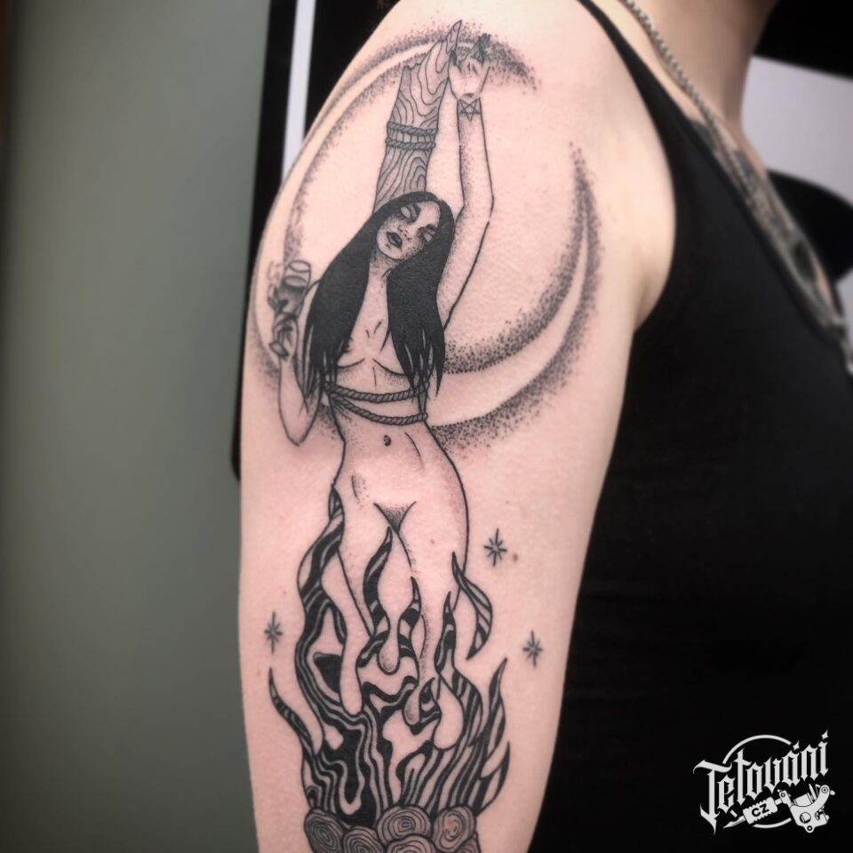 Tetování nadpřirozené bytosti, čarodějnice, měsíc na paži
