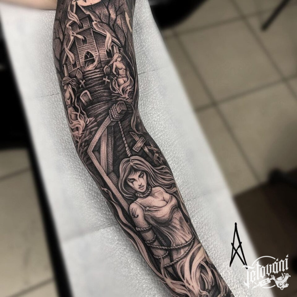 Tetování nadpřirozené bytosti, čarodějnice, rukáv