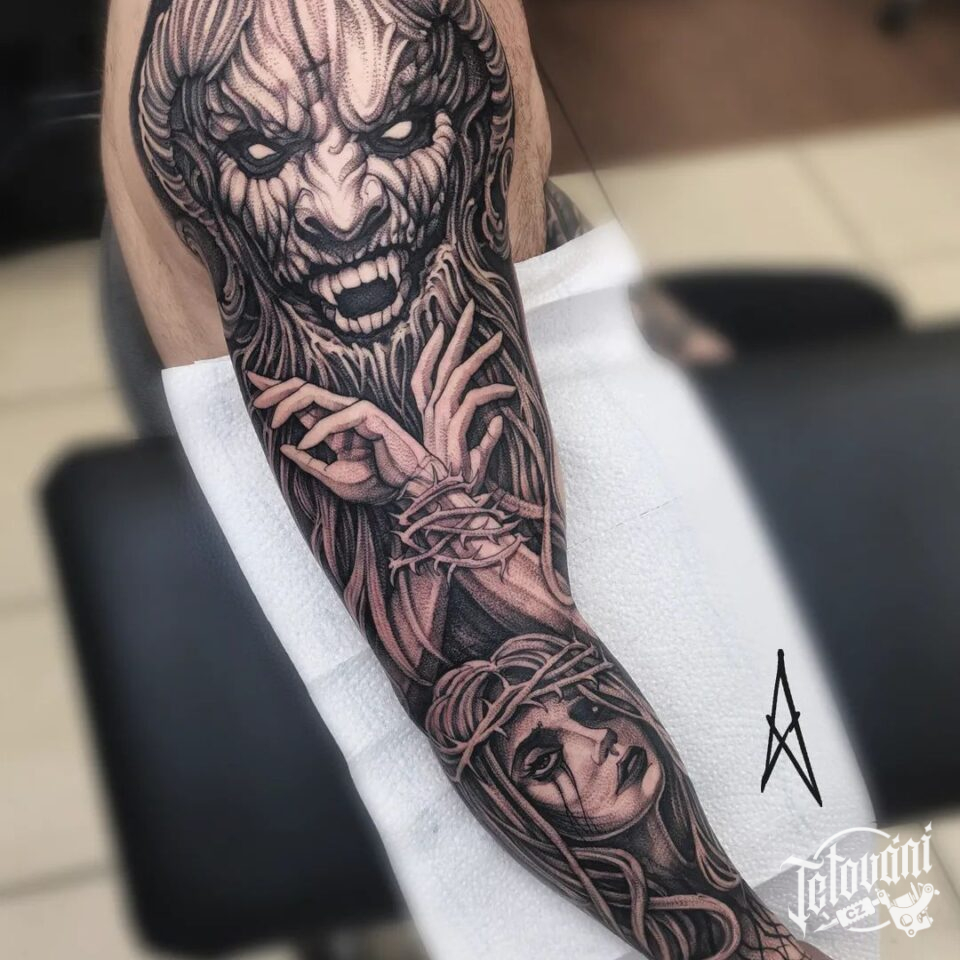 Tetování nadpřirozené bytosti, ďábel, rukáv
