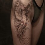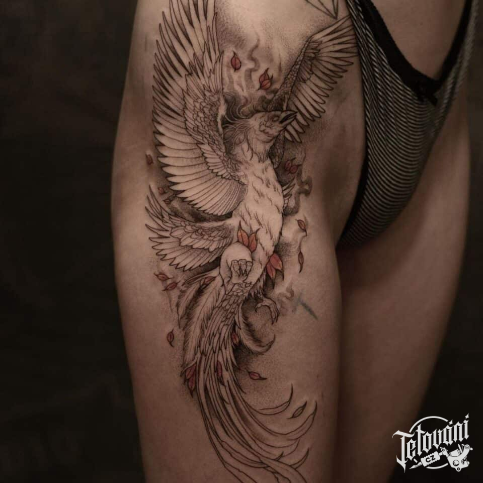 Tetování nadpřirozené bytosti fénix na stehno