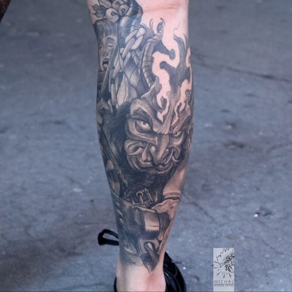 Tetování nadpřirozené bytosti, krampus na lýtku