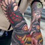 Tetování nadpřirozené bytosti Krampus, symboly na hřbet ruky