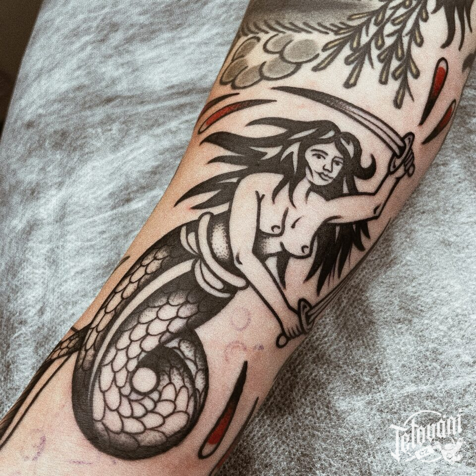 Tetování nadpřirozené bytosti, mořská panna na nohu