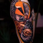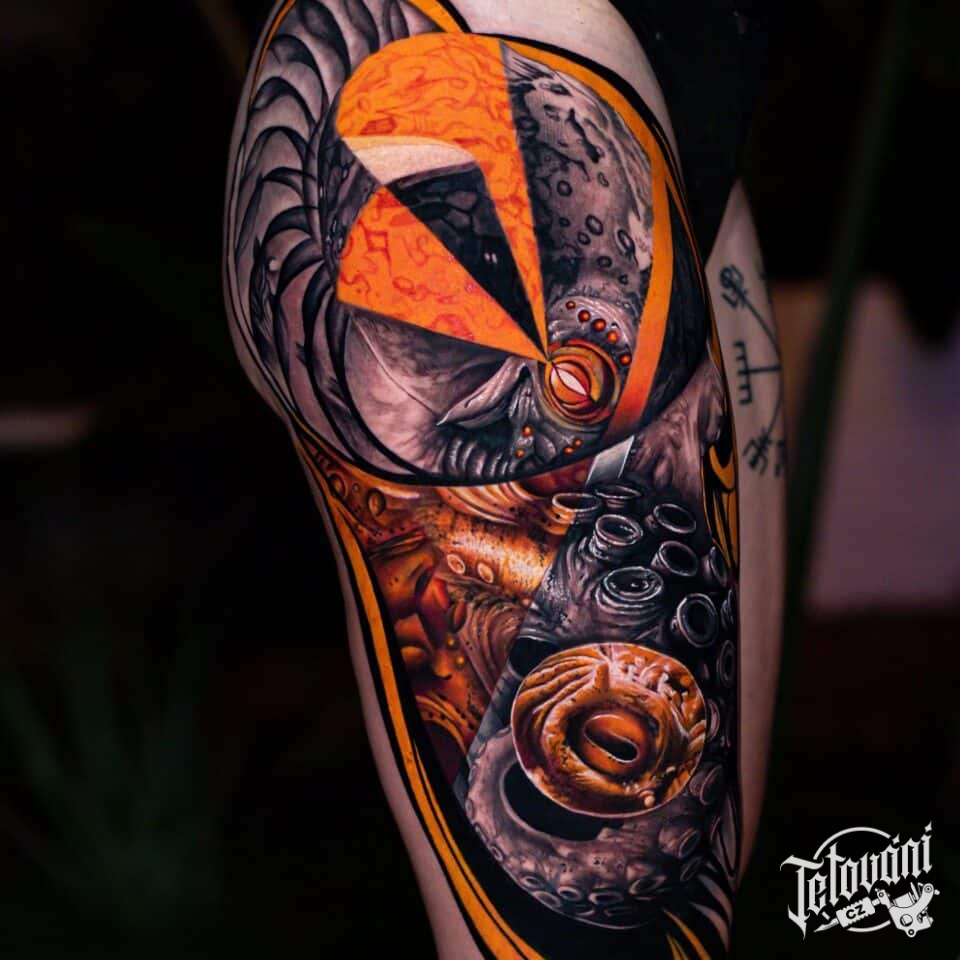 Tetování nadpřirozené bytosti na boku stehna