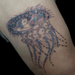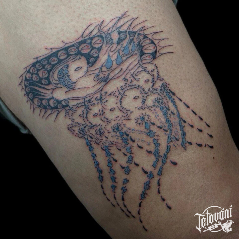 Tetování nadpřirozené bytosti na stehně
