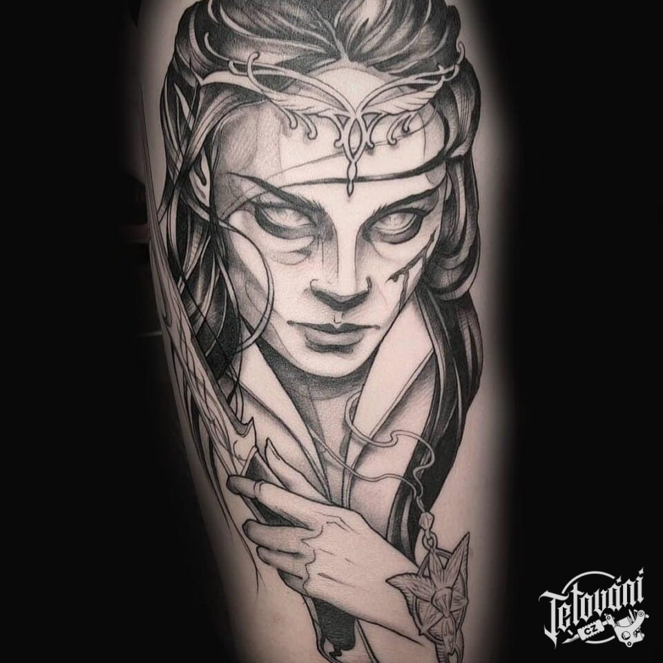 Tetování nadpřirozené bytosti, portrét elfky na rameni