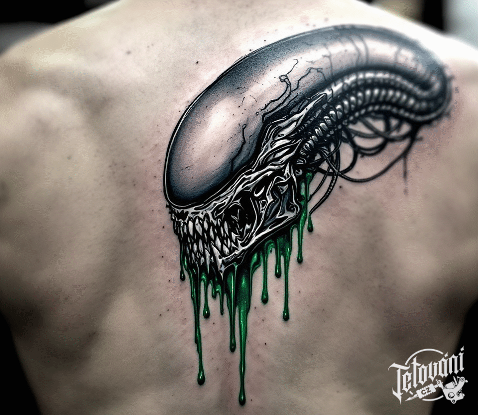 Tetování nadpřirozené bytosti, vetřelec z filmů a pohádek, znamení zla na záda