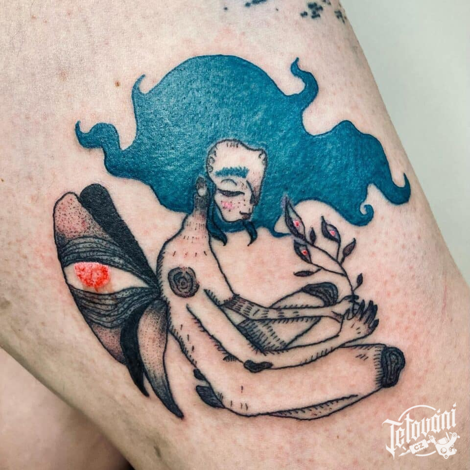 Tetování nadpřirozené bytosti, víla na stehně
