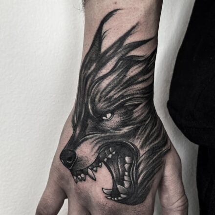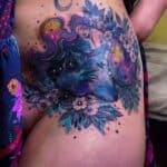 Tetování nadpřirozené bytosti, víla s vlkem na stehně