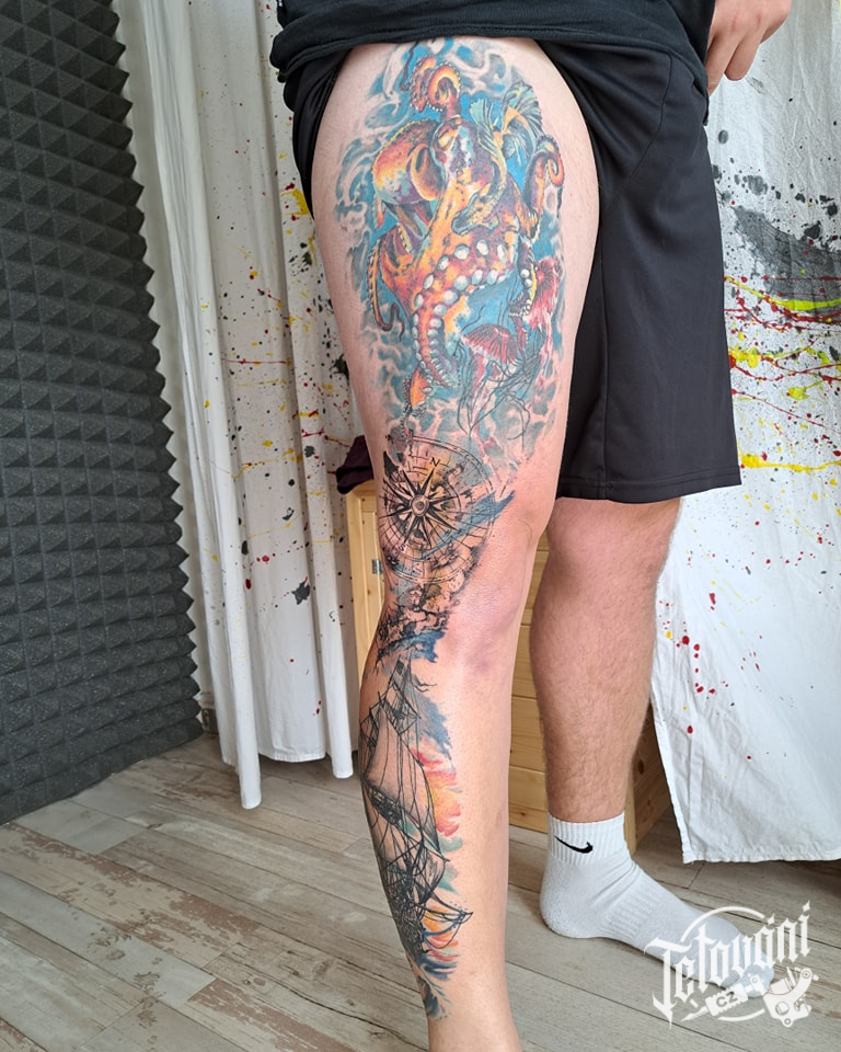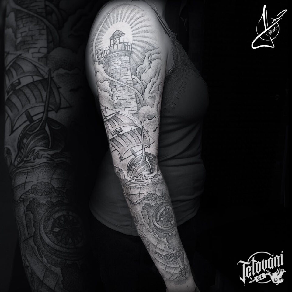 Tetování námořníci, kompas, loď, maják, rukáv