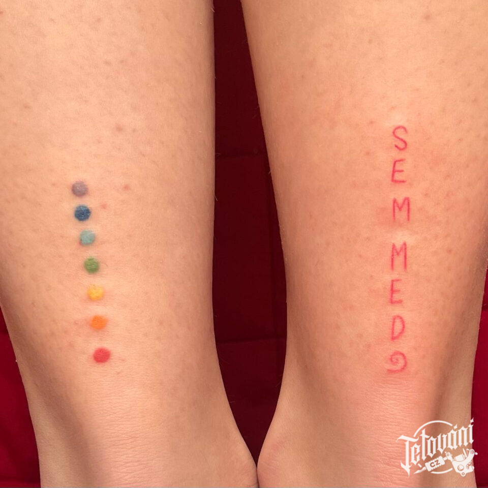 Tetování nápis a barevné tečky na noze