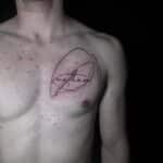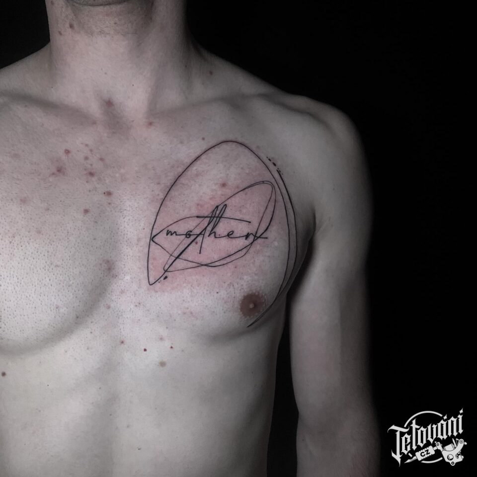 Tetování nápis a čáry na prsa