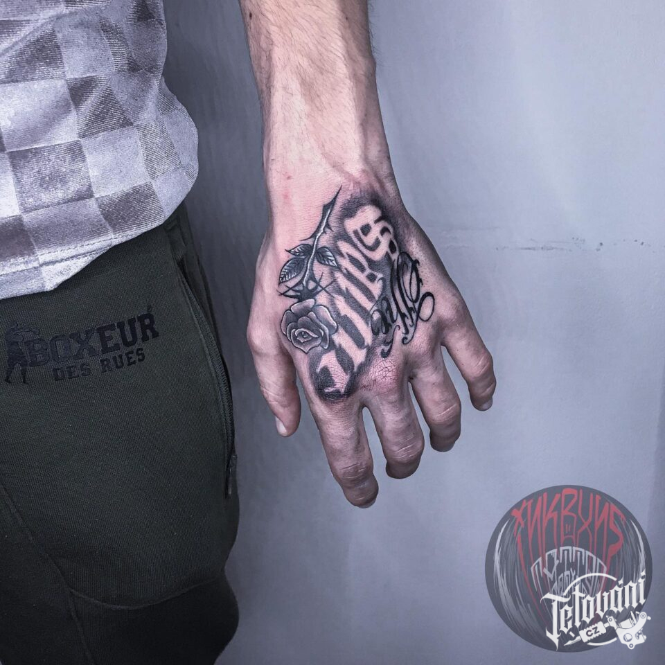 Tetování nápis a květina, růže na ruce