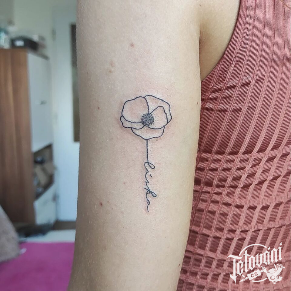 Tetování nápis a květina vlčí mák na paži