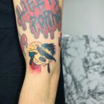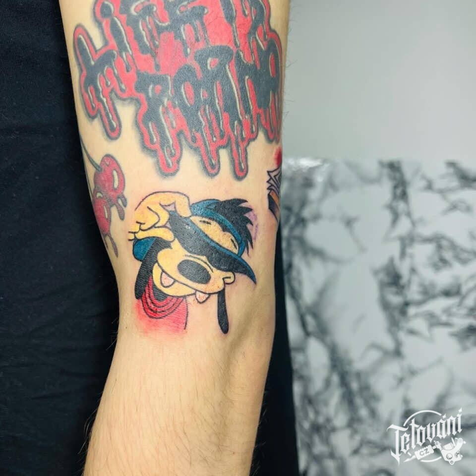 Tetování nápis a postavička z filmů a pohádek na rameno