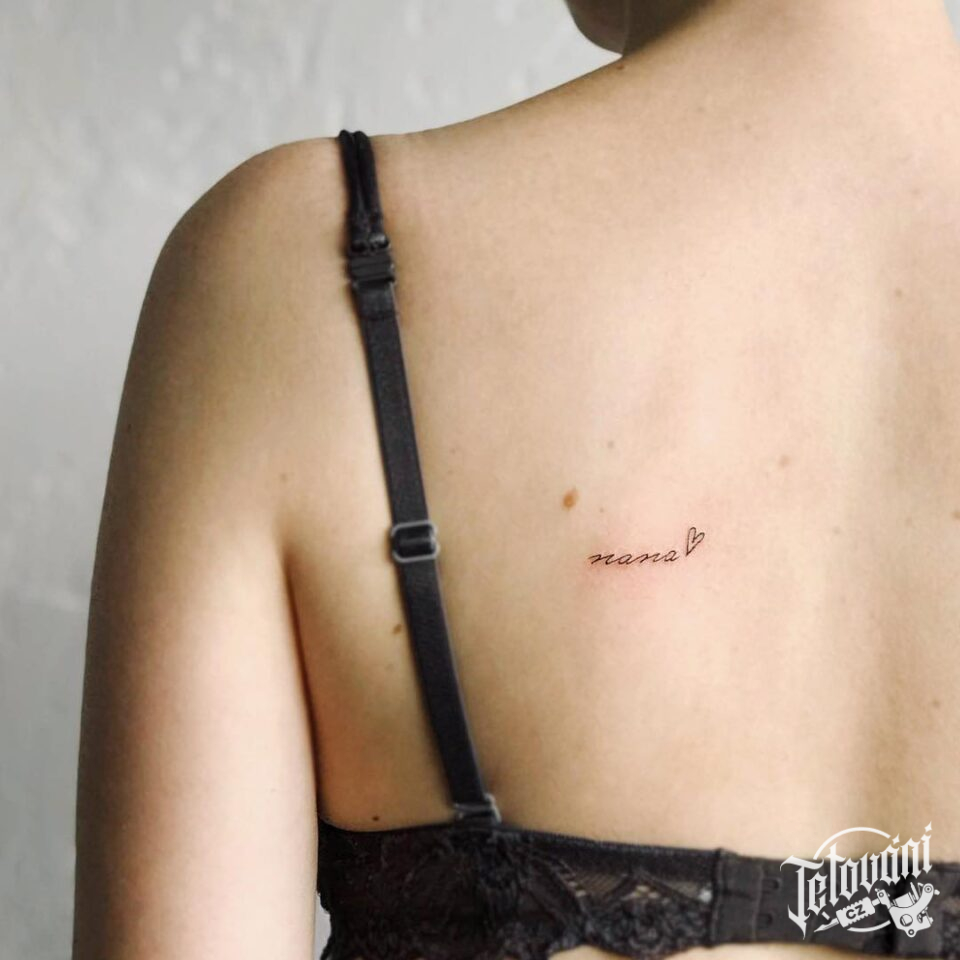 Tetování nápis a srdce na lopatce