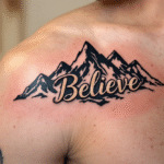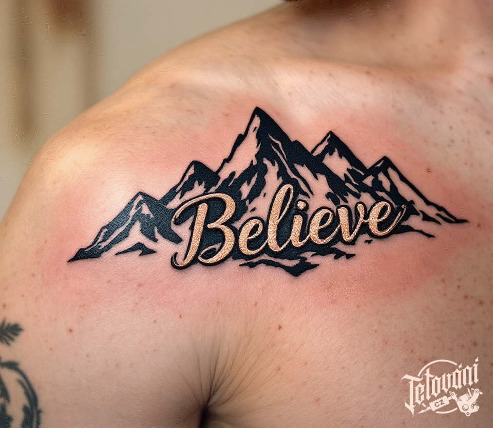 Tetování nápis Believe a hory pod klíční kostí