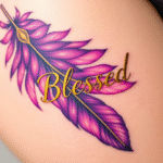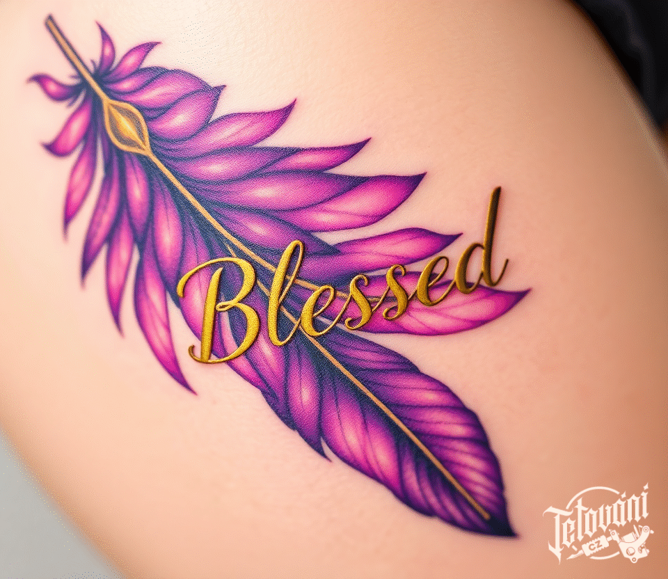 Tetování nápis Blessed, pírko na boku stehna