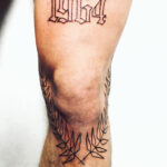 Tetování nápis, čísla, větvičky na koleni