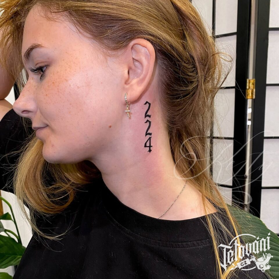 Tetování nápis, čísla za uchem