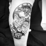 Tetování nápis, číslo 68, předmět peníze, hodiny na ruku