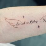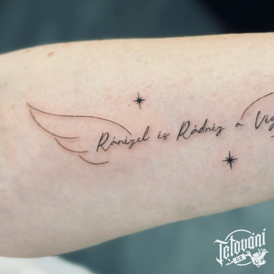 Tetování nápis, citát s křídly na předloktí