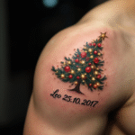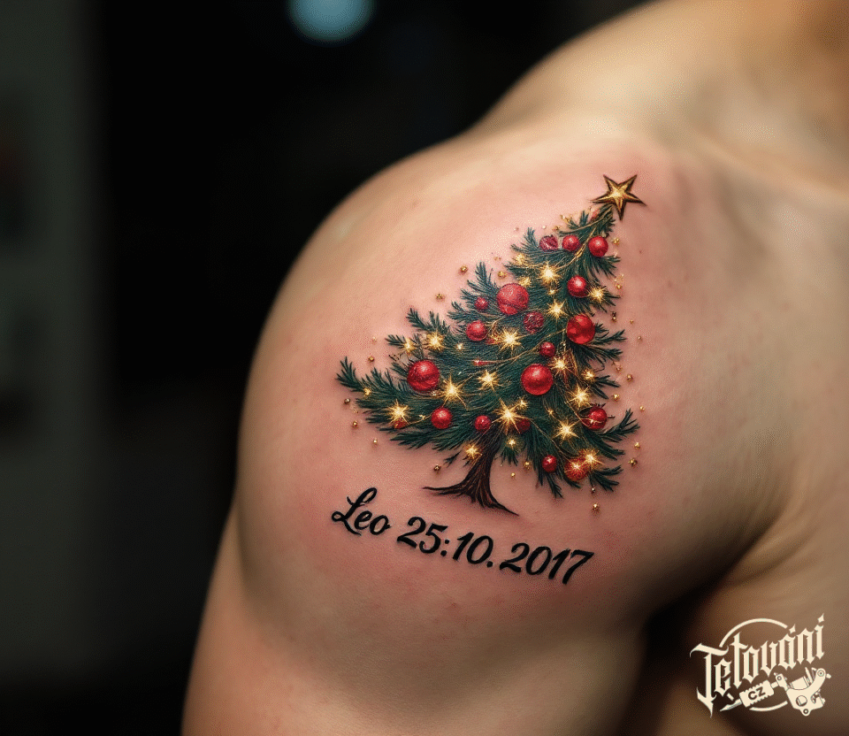 Tetování nápis, datum a jméno, narození dítěte, vánoční strom na rameni