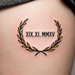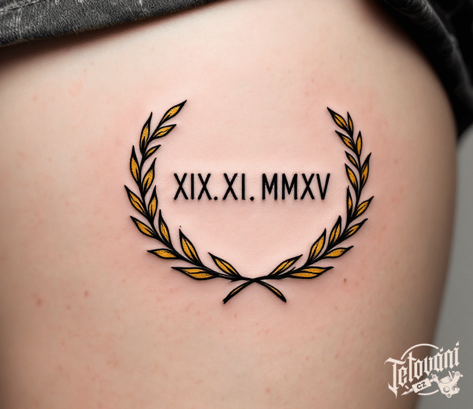 Tetování nápis datum narození, římská čísla, písmena, čísla, větvičky na stehno