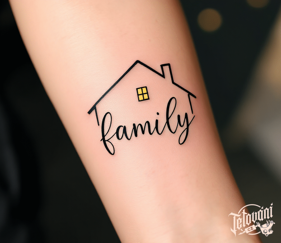 Tetování nápis family a dům na ruku