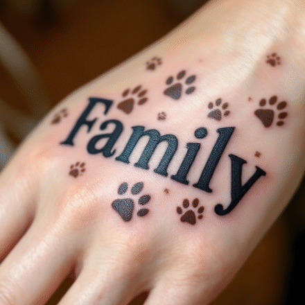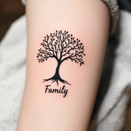 Tetování nápis family a větvička na rameno