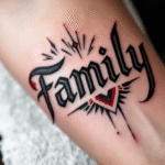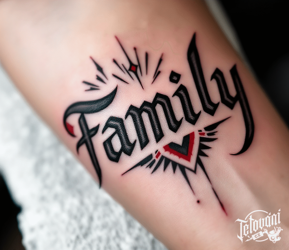 Tetování nápis family s ornamenty na předloktí