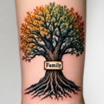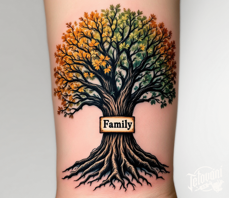 Tetování nápis family, strom rodiny na předloktí
